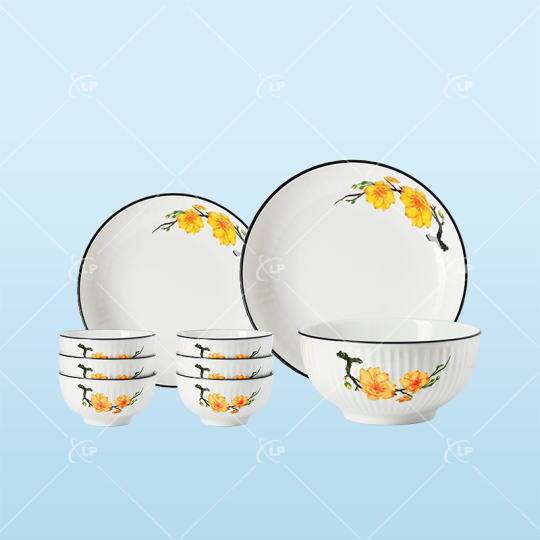 Bộ bát đĩa 9 món sọc chỉ hoa mai - LPBD35
